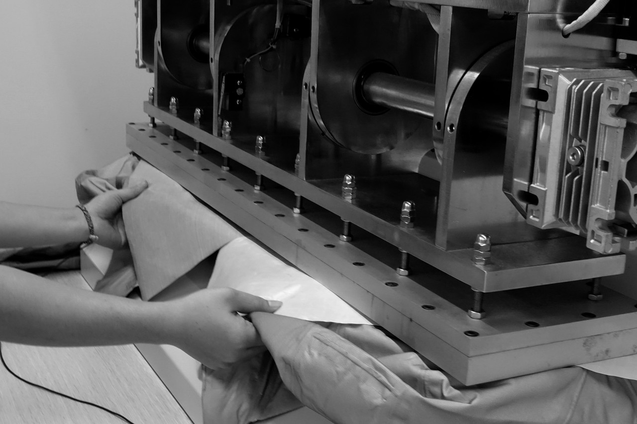 大きなパーツも圧着加工できる専用の装置。