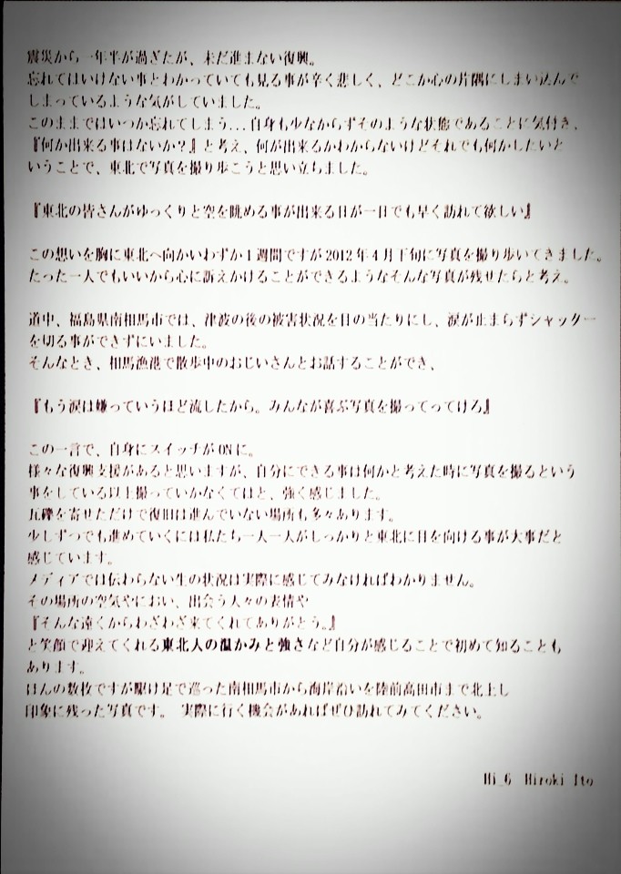 今現在な被災地の状況を伝えるために被災地をまわって撮り歩いたそうです。