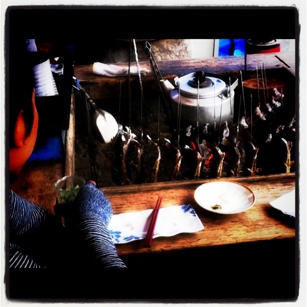 鳩待峠の駐車場に戻ってみると、先に到着していたNJとコウタロウくんは“炭火焼きのイワナ”を食しておりました。